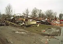 Immediately following the tornado in Comfrey there was uncertainty about the town's long-term survival.[58] Then in the week following the tornado the town decided to rebuild the school, and as a result most of Comfrey's businesses decided to follow suit.[59] Ground was broken on the new school early the next year, and it opened to students on October 4, 1999.[60] The population of Comfrey is down to 367 from the 425 it was when the tornado hit.[47]