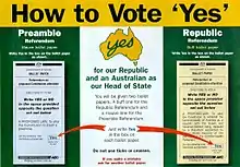 The Australian republic referendum held on 6 November 1999 was a two-question referendum to amend the Constitution of Australia. The first question asked whether Australia should become a republic, with a president appointed by Parliament following a bi-partisan appointment model which had been approved by a half-elected, half-appointed Constitutional Convention held in Canberra in February 1998. The second question, generally deemed to be far less important politically, asked whether Australia should alter the Constitution to insert a preamble.[3] Since the early 1990s opinion polls had suggested that a majority of the electorate favoured a republic in principle.[4] Nonetheless, the republic referendum was defeated.