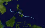 On March 15, the JTWC began monitoring a tropical disturbance, and four days later upgraded it to a tropical depression near Palau.[9][20] The next day, both the JMA and PAGASA classified the system as a depression, and PAGASA named it "Caloy".[22] Moving west-northwestward due to a ridge to the north,[9] the depression moved across the Philippine island of Mindanao on March 21 and continued through the archipelago.[20] Owing to strong wind shear, the system never intensified,[9] and the JMA discontinued advisories on March 23 after the system reached the South China Sea.[22] The JTWC maintained the system as a tropical depression until March 25, when a mid-latitude trough absorbed the system off the east coast of Vietnam.[9]