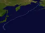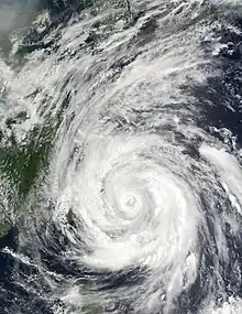 After affecting two countries, Rammasun began weakening due to an approaching trough, which turned the typhoon northeastward. It passed over the Japanese island of Miyako-jima and also produced strong winds in Okinawa.[11] About 10,000 houses lost power on the island,[35] and high surf killed two sailors.[9] On the Japanese mainland, there was light crop damage and one serious injury.[36][37] After weakening into a tropical storm, Rammasun passed just west of the South Korean island of Jejudo,[9] where high waves killed one person.[38] The storm crossed the country, killing three others and leaving $9.5 million in damage.[9] High rains from Rammasun also affected North Korea, and Primorsky Krai in the Russian Far East.[39][40]