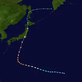 While accelerating northeastward, Hagibis developed a well-defined eye and underwent a period of rapid deepening.[25] On May 19, the JMA estimated peak 10-minute winds of 175 km/h (109 mph),[8] and the JTWC estimated 1-minute winds of 260 km/h (160 mph);[9] this made Hagibis become a second super typhoon after Mitag. At the time of its peak, the typhoon was located about 305 km (190 mi) west-southwest of the Northern Mariana Islands.[25] Hagibis only maintained its peak for about 12 hours,[8] after which the eye began weakening.[25] The trough that caused the typhoon's acceleration also caused the storm to lose tropical characteristics, and dry air gradually became entrained in the circulation.[25] On May 21, Hagibis became extratropical to the east of Japan after having weakened below typhoon intensity. The remnants continued to the northeast and dissipated south of the Aleutian Islands on May 22.[8]