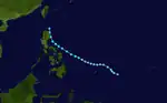 After affecting Yap, Mitag turned to the northwest and later to the north due to an approaching trough.[9] It passed to the north of Palau, contributing to one death there. Despite predictions of weakening,[20] the typhoon continued to intensify, reaching peak 10-minute winds of 175 km/h (109 mph) on March 5.[8] The JTWC estimated peak 1-minute winds of 260 km/h (160 mph) when the storm was about 610 km (380 mi) east of Catanduanes in the Philippines; this made Mitag became a super typhoon, the first one on record in the month of March. The combination of cooler air and interaction with the westerlies caused Mitag to weaken significantly. Only four days after reaching peak winds, the storm had dissipated well to the east of the Philippines.[20]