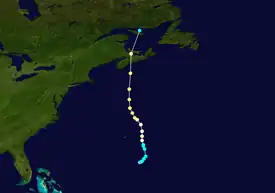 On August 25, a tropical wave emerged off the coast of Africa, and two days later developed enough organized convection to develop into Tropical Depression Ten. Tracking through warm waters and low vertical shear, the depression was named Tropical Storm Fabian on August 28. On August 30, the storm intensified into a hurricane, and it quickly strengthened to attain major hurricane status late that day; on September 1 Fabian reached its peak intensity of 145 mph (233 km/h). The hurricane turned to the north and gradually weakened before passing 14 miles (23 km) west of Bermuda on September 5 with winds of 120 mph (190 km/h). The cyclone accelerated northeastward into an environment of unfavorable conditions, becoming an extratropical cyclone on September 8; two days later it merged with another extratropical storm between southern Greenland and Iceland.[23]