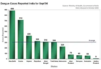 In the 2006 dengue outbreak in India, cases of dengue fever were reported first from New Delhi in early September and by the end of September other states also started to report deaths. At least 3613 confirmed cases of dengue fever were reported and over 50 people died in the outbreak.[1]