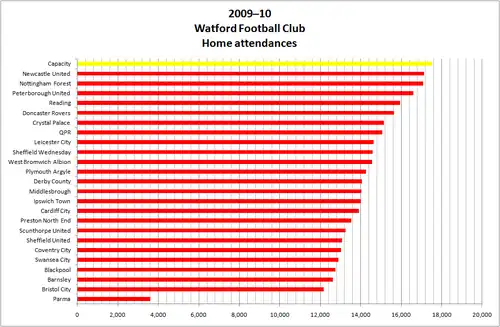 Watford Football Club are an association football club from Watford, Hertfordshire, England. Home matches were played at the club's stadium, Vicarage Road, which had a capacity of 17,504 for the 2009–10 season. Watford's season officially began on 1 July 2009 and concluded on 30 June 2010, although competitive matches were only played between August and May. They competed in the Football League Championship, the second highest division in English football, following their relegation from the Premier League in 2007.
