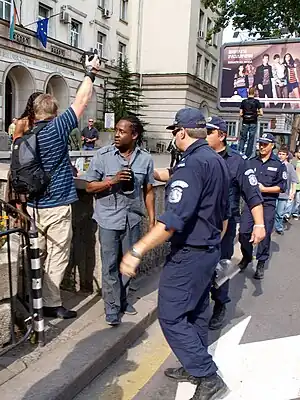 Bulgarian policemen lead a dark-skinned hobby photographer away from the route of the demonstration, to prevent possible beating. White photographers shoot undisturbed.
