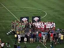 The Independence (gray) and the Flash (red/white) are recognized after the championship game