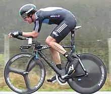 Liquigas–Cannondale rider Tiziano Dall'Antonia was the first to break 23 minutes for the climb,[70] but his stay at the top of the standings was short as Wiggins' team-mate Danny Pate, a former world time trial champion at under-23 level, went substantially quicker than Dall'Antonia, setting a benchmark of 21' 29" for the climb.[71] Wiggins shadowed his team-mate's run, in a car following him up the hill, to gather information about what lay ahead before his start time.[4] Pate's time held for almost 20 minutes until Lotto–Belisol's Bart De Clercq bettered his time, breaking the 21-minute barrier.[69] French riders then lowered the benchmark yet further; David Moncoutié, who finished fourth in the race's last time trial at the Col d'Èze,[68] recorded a time of 20' 11" for Cofidis,[70] but Jean-Christophe Péraud usurped that with the first sub 20-minute time. The Ag2r–La Mondiale rider, the 2009 national time trial champion, recorded a time of 19' 45"; a time that left his team manager Vincent Lavenu elated, with Péraud later expressing his surprise at such a quick time.[72]