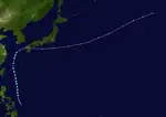 Early on June 16, a tropical depression formed southeast of the Philippines, which PAGASA named Emong.[46][47] Late on June 17, the JTWC initiated advisories on Tropical Depression 04W. The next day, the JMA upgraded the depression to Tropical Storm Leepi on June 18 after further organization and a general northward movement.[46][48] Interaction with a tropical upper tropospheric trough (TUTT) cell to the east of Leepi sheared the convection to the southwest of the center, which consisted of several smaller circulations. Based on this occurrence, the JTWC downgraded the system to tropical depression intensity early on June 20,[49] and early the next day, the JMA declared Leepi as extratropical near southwestern Japan. The storm fully dissipated early on June 24.[46]