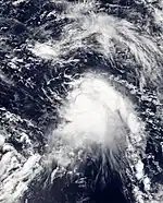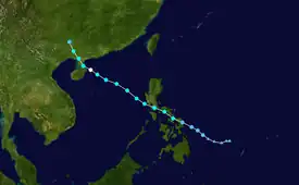 In late June, a low-pressure area persisted within the ITCZ east of the Philippines. Initially tracking southward, the disturbance moved east and then recurved to the west.[67] Steadily organizing, the disturbance became a tropical depression on June 27,[68] moving to the northwest due to a nearby ridge.[69] On June 28, the disturbance strengthened into Tropical Storm Rumbia, and the next day made its first landfall on Eastern Samar in the Philippines.[68][70] Rumbia spent roughly a day moving across the archipelago before emerging into the South China Sea,[71][72] where it resumed strengthening to a peak of 95 km/h (60 mph) on July 1, a severe tropical storm.[68] The storm weakened slightly before moving ashore the Leizhou Peninsula in China late that day. Due to land interaction, Rumbia quickly weakened into a low-pressure area on July 2 and dissipated soon after.[73]