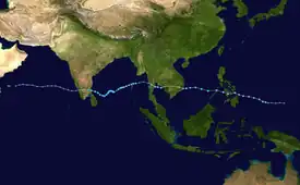 Early on January 6, the JMA started to monitor a tropical depression that had developed, about 480 km (300 mi) to the southeast of Melekeok, Palau.[24] Over the next few days the JMA continued to monitor the system as a tropical depression, before PAGASA named it Bising during January 11.[25][26][27] Over the next few days the system moved towards the north-northeast, before it was last noted during January 13, as it weakened into an area of low pressure.[25][26][28]