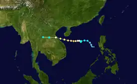 In mid-June, strong but disorganized convection persisted in the South China Sea approximately 1,110 km (690 mi) south of Hong Kong.[56] The disturbance gradually organized, and was classified as a tropical depression by the JMA at 1800 UTC on June 19;[57] PAGASA followed suit six hours later, naming the system Fabian.[58] Despite wind shear generated by a subtropical ridge, the depression maintained a well-defined circulation, allowing the system to intensify.[59] At 0000 UTC on June 21, the JMA upgraded the cyclone to Tropical Storm Bebinca.[60] Following this upgrade in strength, however, Bebinca failed to intensify further, and leveled out in intensity prior to making landfall on Hainan on June 22. Bebinca's passage weakened the system to tropical depression strength, and, despite moving over the Gulf of Tonkin, failed to restrengthen before making a final landfall on June 23 east of Hanoi.[61]