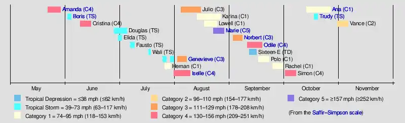 The season's first named storm, Amanda, developed on May 23, shortly after the official start to the Pacific hurricane season on May 15. On May 24, the system intensified into a hurricane, transcending the climatological average date of June 26 for the first hurricane. The next day, Amanda attained major hurricane status, over a month sooner than the average date of July 19.[11] Owing to Amanda's extreme intensity the ACE value for May was the highest on record in the East Pacific at 18.6 units, eclipsing the previous record of 17.9 units set in 2001.[12] Hurricane Cristina became the second's major hurricane, the system broke the previous record set by Hurricane Darby in 2010 which reached major status on June 25. However, this record was broken by Hurricane Blanca in 2015 which reached major status on June 3. Through June 14, the seasonal ACE reached its highest level since 1971, when reliable records began, for so early in the season. By the end of June, the ACE total remained at 230% of the normal value,[13] before subsiding to near-average levels to end July.[14] By late July, the basin became rejuvenated, with 3 systems forming during the final 10 days of the month. Activity in August ramped up significantly, with four hurricanes developing during the month, two of which became major hurricanes, excluding Iselle and Genevieve, which formed in July, but became a major hurricane during August. By the end of August, ACE values rose to 60% above the 30-year average.[15]