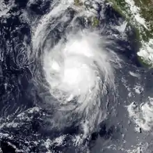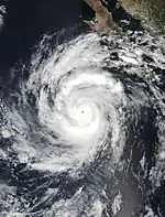 Continued, though less prolific, activity extended through September with four hurricanes developing that month. ACE values remained 45% above-average by the end of the month.[16] Following the rapid intensification of Hurricane Simon to a Category 3 hurricane during the afternoon of October 4, the 2014 season featured the highest number of major hurricanes in the Eastern Pacific basin since the advent of satellite imagery. With eight such storms east of 140°W, the year tied with the record set in the 1992 season.[17][18] However, this record was surpassed by the 2015 Pacific hurricane season.