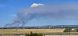 ![]() A plume of smoke emerging from the Adelaide Hills region during the bushfires, 2 January 2015. The Adelaide city centre is the cluster of buildings visible centre right. | |