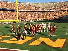Minnesota faced all six West Division opponents: Illinois, Iowa, Nebraska, Northwestern, Purdue, and Wisconsin. The Gophers also faced East Division opponents Maryland, Penn State, and Rutgers.[1] Minnesota played three non-conference games: Oregon State of the Pac-12 Conference, Indiana State of the Missouri Valley Football Conference, and Colorado State of the Mountain West Conference. Minnesota had one bye week during the season between their games against Indiana State and Colorado State.