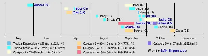 Tropical cyclogenesis began with the formation of Tropical Storm Alberto on May 25, marking the fourth consecutive year that activity began early.[22] However, no storms developed in the month of June. July saw the formation of Beryl and Chris, both of which intensified into hurricanes. August also featured two named storms, Debby and Ernesto, though neither strengthened further than tropical storm status. On August 31, the depression that would later become Hurricane Florence developed. September featured the most activity, with Florence, Gordon, Helene, Isaac, Joyce, Tropical Depression Eleven, Kirk, and Leslie also forming or existing in the month.[23] Florence, Helene, Isaac, and Joyce existed simultaneously for a few days in September, becoming the first time since 2008 that four named storms were active at the same time.[22] The season also became the second consecutive year with three hurricanes simultaneously active.[25]