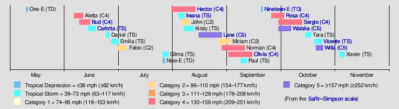 The 2018 Pacific hurricane season was one of the most active Pacific hurricane seasons on record, producing the highest accumulated cyclone energy value on record in the basin. The season had the fourth-highest number of named storms – 23, tied with 1982.[nb 1] The season also featured eight landfalls, six of which occurred in Mexico. The season officially began on May 15 in the Eastern Pacific, and on June 1 in the Central Pacific; they both ended on November 30. These dates conventionally delimit the period of each year when most tropical cyclones form in the Pacific basin. However, tropical cyclone formation is possible at any time of the year, as illustrated when the first tropical depression formed on May 10, five days prior to the official start of the season.