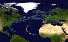 A large area of disturbed weather persisted over the central subtropical Atlantic in mid-November. On 19 November, this area of thunderstorm activity developed sufficiently to be designated Tropical Storm Sebastien by the National Hurricane Center in Miami, Florida.[80] After several days of slow movement, Sebastien accelerated towards the north-east and began slowly losing tropical characteristics. The system completed its extratropical transition late on 24 November,[80] becoming extratropical Storm Sebastien in the process.[81][82]
