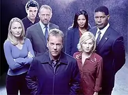 Season 2 main cast: (from left to right, back row) Sarah Wynter, Carlos Bernard, Xander Berkeley, Penny Johnson Jerald, and Dennis Haysbert; (from left to right, front row) Kiefer Sutherland and Elisha Cuthbert