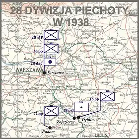 In 1921–1939, the 28th Division was part of the 1st Military District. In 1922, the 28th Light Artillery Regiment was moved from Radom to Zajezierze near Dęblin, and in April 1922, the 72nd Infantry Regiment was transferred from Warsaw to Radom.