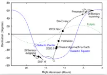 As seen from Earth, the comet was in the northern sky from September until mid-November. It crossed the ecliptic plane on 26 October near the star Regulus,[40] and the celestial equator on 13 November 2019, entering the southern sky. On 8 December 2019, the comet reached perihelion (closest approach to the Sun)[3] and was near the inner edge of the asteroid belt. In late December, it made its closest approach to Earth,[11][14] 1.9 au, and had a solar elongation of about 80°.[5] Due to its 44° orbital inclination, 2I/Borisov did not make any notable close approaches to the planets.[3] 2I/Borisov entered the Solar System from the direction of Cassiopeia near the border with Perseus. This direction indicates that it originates from the galactic plane, rather than from the galactic halo.[39][41] It will leave the Solar System in the direction of Telescopium.[39][41] In interstellar space, 2I/Borisov takes roughly 9000 years to travel a light-year relative to the Sun.[lower-alpha 5]