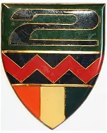 This accounts for the unit insignia including at the top the number "2" in infantry colours, with the St Barbara's lightning flash representing the artillery in the middle and armour's old heraldic colours at the bottom.