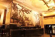 After the building had opened, Sert was commissioned to paint the mural American Progress at the center of the lobby,[93][105][106] measuring 50 by 17 feet (15.2 by 5.2 m).[107] The mural was installed in 1937.[108][109][37] It depicts a vast allegorical scene of men constructing modern America and contains figures of Abraham Lincoln, Mahatma Gandhi, and Ralph Waldo Emerson.[105][110][92] The space occupied by American Progress was originally taken up by Diego Rivera's Man at the Crossroads mural,[93][106][111][112] which was controversial because of its communist imagery and was destroyed in 1934.[113][114] Rockefeller officials commissioned a sixth mural from Sert, representing the past, present, and future, which they installed in the lobby in 1941.[49][115] The mural measures 100 by 50 feet (30 by 15 m) and is installed on the ceiling.[92][116]