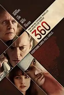 360 is a 2011 internationally produced drama thriller film directed by Fernando Meirelles and written by Peter Morgan as a loose adaptation of Arthur Schnitzler's 1897 play Reigen. The film stars an ensemble cast of Anthony Hopkins, Ben Foster, Rachel Weisz, Jude Law and other international actors. Following the stories of couples and their sexual encounters, 360 was selected to open the 2011 London Film Festival. Magnolia Pictures released the film on video on demand on 29 June 2012 and was released in United States theaters on 3 August 2012. The film reunited Weisz and director Meirelles, who worked together on The Constant Gardener.