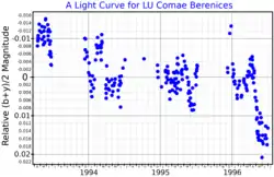 ![]() A light curve for LU Comae Berenices, adapted from Henry et al. (2000).[1] The plotted brightness is the average of the Strömgren b and y magnitudes. | |