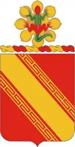 The shield is red for Artillery with a gold bend from the arms of Lorraine, cottised potenté counterpotenté as in the arms of Champagne.