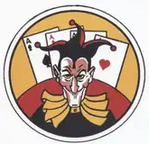- ↑ Approved 10 May 1943.Description: On a disc per fess debased arched, orange and red, within a border black, piped white, four playing cards (aces) arranged spades, diamonds, clubs, and hearts, reading from dexter to sinister, issuing from arched segment in base, all behind a knave with evil facial expression, wearing black suit, orange collar, black hat of three points, trimmed and balled in each point of red.