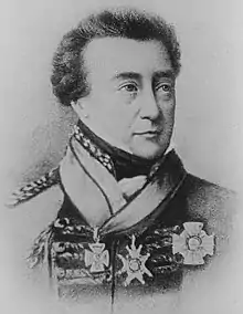 The battalion earned the regiment its nickname of "the Die Hards" after their participation in the Battle of Albuera, (order of battle) one of the bloodiest battles of the war, in May 1811.[13] The commanding officer of the battalion, Colonel William Inglis, was struck down by a charge of canister shot which hit him in the neck and left breast. He refused to be carried to the rear for treatment, but lay in front of his men calling on them to hold their position and when the fight reached its fiercest cried, "Die hard the 57th, die hard!".[14] The casualties of the battalion were 422 out of the 570 men in the ranks and 20 out of the 30 officers.[6] The Allied commander of the Anglo-Portuguese force General William Beresford wrote in his dispatch, "our dead, particularly the 57th Regiment, were lying as they fought in the ranks, every wound in front".[15]