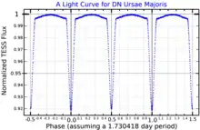 65 Ursae Majoris A is a variable star with the variable star designation DN Ursae Majoris. The pair Aa1 and Aa2 form an eclipsing binary as they periodically pass in front of each other while orbiting. The primary and secondary eclipses are almost identical and the apparent magnitude of the system varies between 6.55 and 6.65 twice during each orbit of 1.73 days.[16] The brightness variation is very small because the non-eclipsing component Ab is the brightest of the three stars and contributes 80% of the visible light.[5]