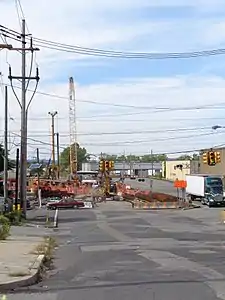 While not officially part of the rail projects, the 69th Street Bridge is seen as a significant component in success of its operations. The bridge replaced the earlier grade crossing at the north end CSX North Bergen Yard and NYSW siding between Tonnelle Avenue and West Side Avenue.[4] Significant delays caused by long trains created traffic congestion for those working and shopping in the area.[9] Ground was broken in October 2008 but construction was delayed for years due to the first construction company's inadequacies and subsequent cancellation of their contract. It finally opened in February 2019.[10][11]