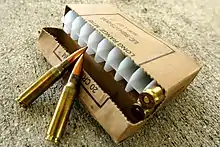 Current unlinked ammunition is supplied in M19A1 boxes containing 200 rounds divided across four bandoliers containing five-round charger clips[32] or 300 rounds divided across eight cartons.[33][34] Linked ammunition has been primarily supplied in M19A1 boxes containing one 200-round belt each; the belt can consist either of ball rounds only or of a sequence of four ball rounds followed by one tracer.[35] Historically, both linked and unlinked rounds have also been supplied in wooden boxes containing 500 rounds in bandoliers.[36][37]