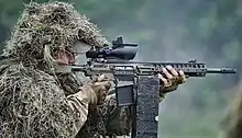 Specialized loadings were created for 7.62×51mm NATO-chambered sniper rifles. They used heavier and more aerodynamic bullets that had a higher ballistic coefficient than standard ball rounds, meaning they shed velocity at longer ranges more gradually.[11] Maintaining velocity is important for accurate long-range shots because dropping from supersonic to transonic speeds disturbs the flight of the bullet and adversely affects accuracy. The standard M80 ball round weighs 147 gr and from an M14 rifle and M60 machine gun has a muzzle velocity 200 ft/s (61 m/s) faster than the M118LR 175 gr sniping round. However, the M80 drops to subsonic velocity around 900 m (984 yd), while the initially slower M118LR is supersonic out to 1,000 m (1,094 yd) due to its low-drag bullet.[12]