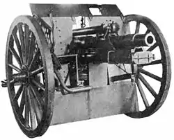The gun's hydro-spring recoil system consisted of an oil cylinder on top of the barrel and two spring cylinders underneath. It did not work at high elevation angles,[3] and by early 1918 production of the US version of the French Canon de 75 modèle 1897 was emphasized.[2] By the end of 1918, shortly after the war ended, only 251 weapons had been completed; 34 had been shipped to France but did not see action. A combination of a limited pre-war munitions industry, the short (19-month) US participation in the war, technical problems with large-scale production, and the ready availability of munitions in France led to this.