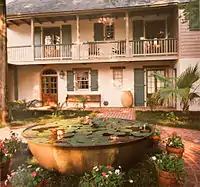 Town's earlier homes borrowed from American colonial architecture and Georgian architecture influences. As his career progressed he began developing his own style influenced heavily by Spanish and French architecture. Interior courtyards and fountains reflect the Spanish tradition, while raised exterior stairs and French doors reflect the Creole influence of New Orleans. Town also took the climate of southern Louisiana into account while designing his homes, using large roof overhangs, an abundance of breezeways, and cross ventilation to provide air circulation. He designed the French Quarter Lamp produced by Andrew Bevolo.[1]