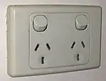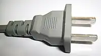 This Australian/New Zealand standard is used in Australia, New Zealand, Fiji, Tonga, Solomon Islands, and Papua New Guinea. It defines a plug with an earthing pin, and two flat current-carrying pins which form an inverted V-shape.[10] The flat pins measure 6.5 by 1.6 mm (0.256 by 0.063 in) and are set at 30° to the vertical at a nominal pitch of 13.7 mm (0.539 in). Australian and New Zealand wall sockets (locally often referred to as power points) almost always have switches on them for extra safety, as in the UK. An unearthed version of this plug with two angled power pins but no earthing pin is used with double-insulated appliances, but the sockets always include an earth contact.