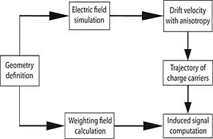 Multi Geometry Simulation is one of the most developed packages for the analysis are uses multi step algorithm. As shown in the figure, results from the each stage of the calculation are stored in matrices which are later recalled to generate the pulse shape response which is determined by the charge carriers through the weighted field. The crystal volume is divided into cubic matrices for a given detector. For each position the values of the electrical potential, electric field and weighted field are calculated and the drift velocity matrices are calculated from the electric field matrix.