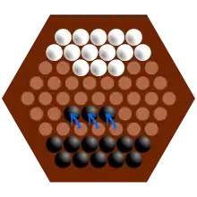 The board consists of 61 circular spaces arranged in a hexagon, five on a side. Each player has 14 marbles that rest in the spaces and are initially arranged as shown below, on the left image. The players take turns with the black marbles moving first. For each move, a player moves a straight line of one, two or three marbles of one color one space in one of six directions. The move can be either broadside / arrow-like (parallel to the line of marbles) or in-line / in a line (serial in respect to the line of marbles), as illustrated below.[2]
