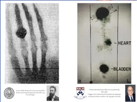 Comparative images of the first X-ray (left) and the first total body FDG-PET scan (right), the latter pioneered by Abass Alavi. These diagnostic tools have revolutionized modern medicine, with the FDG-PET scan having an impact akin to that of the first X-ray.