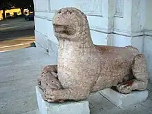 There is no knowledge of the pictorial and stone decorations that once must have adorned the building: the only major fragments that have survived come from the church's main portal or "royal door," carved as part of Gonterio's building site and still intact at the end of the 18th century. The remains consist of part of the lunette above the lintel, conformed in a succession of small arches with a human figure in the center, probably Jesus, and three lions: two of them are now preserved at the entrance to the Leno parish church, while the third, one of the two stylophores that supported the columns of the prothyrum, is inside the town hall of the town.[86][35]