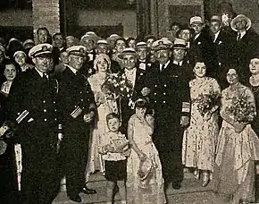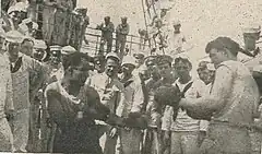 Hollandersky's long career with the Navy included work as an independent supply boat operator or "bum boater" from which he sold magazines and newspapers to the fleet. His boat was a small motorized dingy that was rumored to have been given to him by Admiral Robley Evans. Early in his career, Abe saved several people from drowning and rescued stranded boats in Gardiner Bay off the docks of New London while "bum boating" for the Navy. "Bum boating" consisted of taking a small launch out to naval vessels and selling newspapers, magazines, and small supplies to Navy personnel. In his small launch, he also performed tasks such as delivering mail to naval ships.[49] In his mid-career with the Navy, he worked as a boxing instructor for sailors at the pier in New London near the end of WWI, and as a recruiter of 1,700 naval personnel in WWII while he was living in Los Angeles. He also gave boxing exhibitions and training, and sold newspapers to Naval ships during his world cruises. After cruising to California in 1925, Abe helped the Navy provide relief for the aftermath of the Santa Barbara earthquake that struck on June 25, 1925. He raised War Bonds in WWII, occasionally capitalizing on his contacts with former boxers, and entertainers, such as Jimmy Durante, with whom he had worked in a movie. He later assisted the Navy in providing relief following the March 10, 1933 Los Angeles area earthquake that had an epicenter near Long Beach, California, where he had his news stand. He was caught in the earthquake on the day it struck, and narrowly escaped injury.[50] By 1947, the Navy bestowed on Abe the "Award of Merit" for his recruiting of both men and women for WWII.[51]