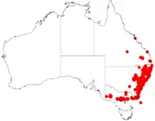 The species occurs on sandy or clay loam in dry sclerophyll forest, woodland or heath in southern and eastern Victoria, New South Wales and Queensland.[2] It is found throughout the Great Dividing Range from around the Grampians in Victoria in the south through New South Wales and up to around Burra Burri in Queensland.[5]