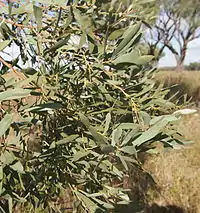 Acacia cambagei, commonly known as gidgee, stinking wattle, stinking gidgee in English, or gidjiirr, by transliteration from indigenous languages of north-western NSW,[1] is an endemic tree of Australia. It is found primarily in semiarid and arid Queensland, but extends into the Northern Territory, South Australia and north-western New South Wales. It can reach up to 12 m in height and can form extensive open woodland communities.[2] The leaves, bark, and litter of A. cambagei produce a characteristic odour, vaguely reminiscent of boiled cabbage, gas or sewage that accounts for the common name of "stinking gidgee".