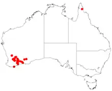 It is native to an area in the Wheatbelt and Goldfields-Esperance regions of Western Australia where it is commonly situated on undulating plains growing sandy or clay-loam soils.[1] It has a scattered distribution from around Cadoux in the north west down to around Dunn Swamp about 100 km (62 mi) north of Raventhorpe in the south east.[2]
