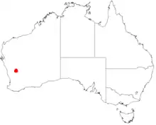 It is native to a very small area around Yalgoo in the Wheatbelt region of Western Australia where it is often situated on rocky hills and grows in rocky red loamy soils[2] as a part of tall shrubland communities. It is known from six subpopulations around in the area around Mount Singleton that is situated about 300 km (190 mi) north east of Perth, four of these subpopulations are found about Ningham Station and two at Mount Gibson Station. The total population is estimated at 550 mature plants.[4]