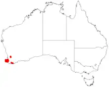 It is native to an area along the south coast in the South West and Great Southern regions of Western Australia where it is commonly situated along drainage lines or in swampy areas growing in sandy soils often over and around laterite.[1] The bulk of the population is found from around Yallingup in the west to Boyanup in the north down to August in the south west to around Nannup in the south east where it is usually found as a part of Eucalyptus forest communities.[2]